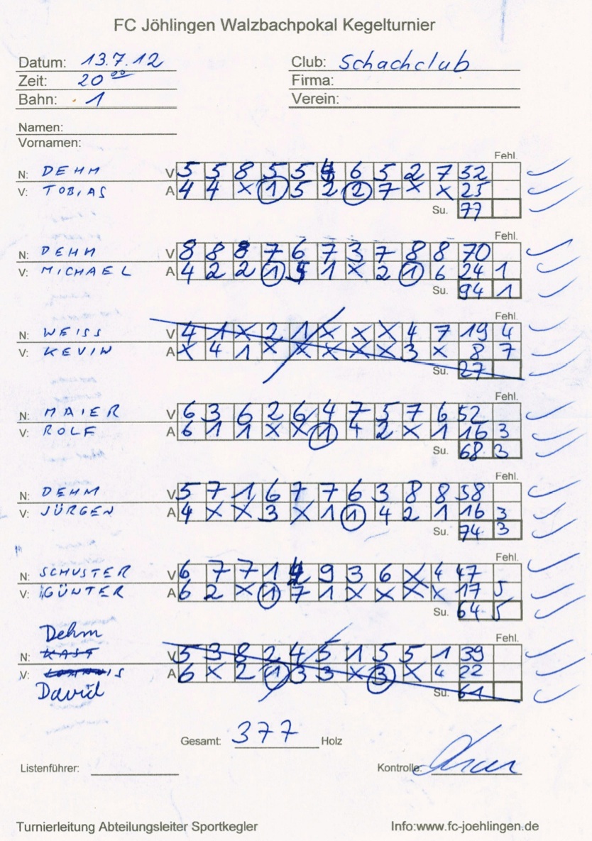 Ein sensationelles Einzelergebnis erreichte Michael Dehm der bereits mit 10 Wurf auf die Vollen 70 Punkte hatte. Am Ende waren es dann 94 Punkte was auch zum besten Spieler des Turniers reichte.