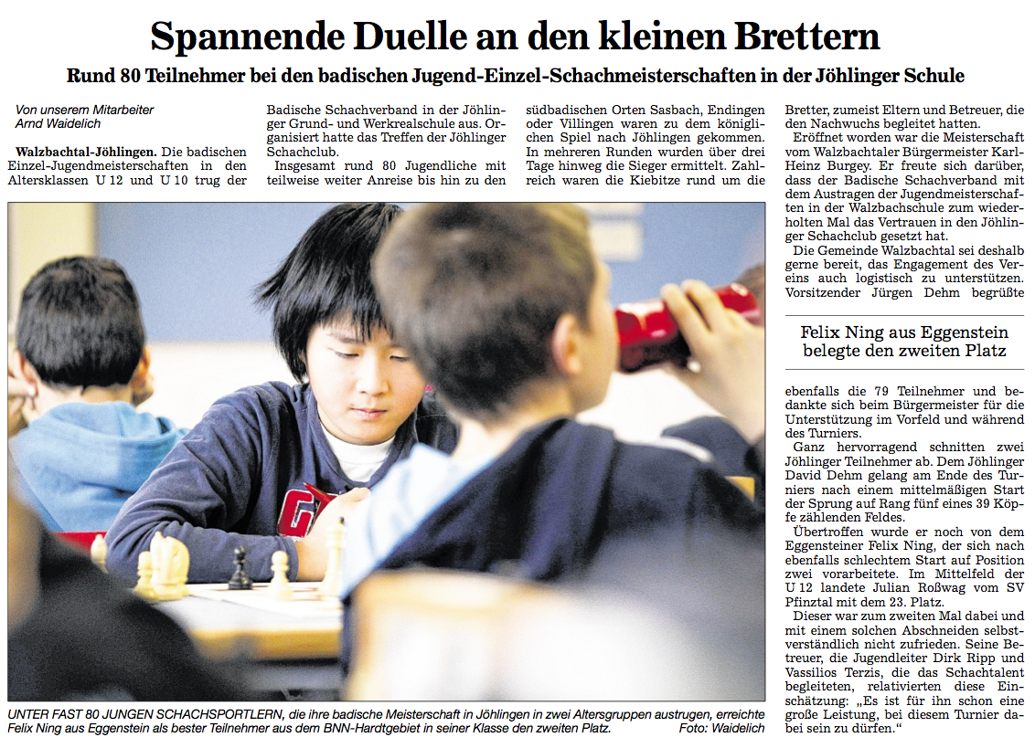 Kurz nach Jahreswechsel trafen sich die besten Jugendspieler Badens zu den Badischen Einzelmeisterschaften. Diese wurden für die Altersklassen U10 und U12, sowie in einer offenen Meisterschaft in der Altersklasse U8 in der Walzbachschule in Jöhlingen durchgeführt. Unser Schachklub übernahm dabei die Turnierorganisation, die Betreuung und die Verpflegung. Bei der Betreuung und Durchführung des U8-Turniers erhielten wir große Unterstützung durch die Karlsruher Schachfreunde.
