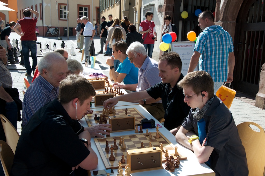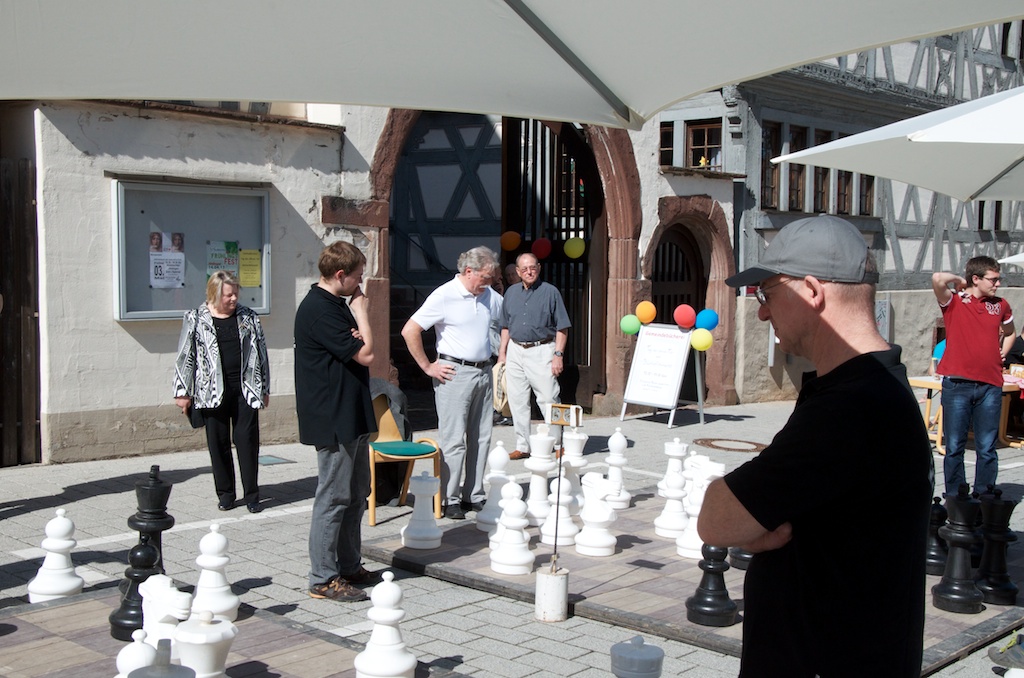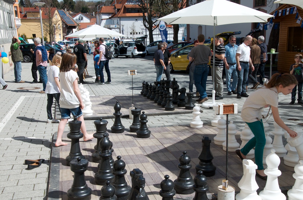 Bei strahlendem Sonnenschein wurde heute in Walzbachtal das Frühlingsfest gefeiert. Auch unser Schachklub beteiligte sich an diesem Event. An zwei großen Gartenschachbrettern und vier normalen Schachbrettern konnten sich die Einwohner am Schachspiel probieren, gegen einen Vereinsspieler ihr Können testen oder einfach eine lockere Partie Schach spielen. Neben einem Flyer, der den Schachklub etwas näher beschreibt und Informationen über unseren Verein enthält, gab es für die kleinen Schachtalente leckere Schokoladenschachfiguren.