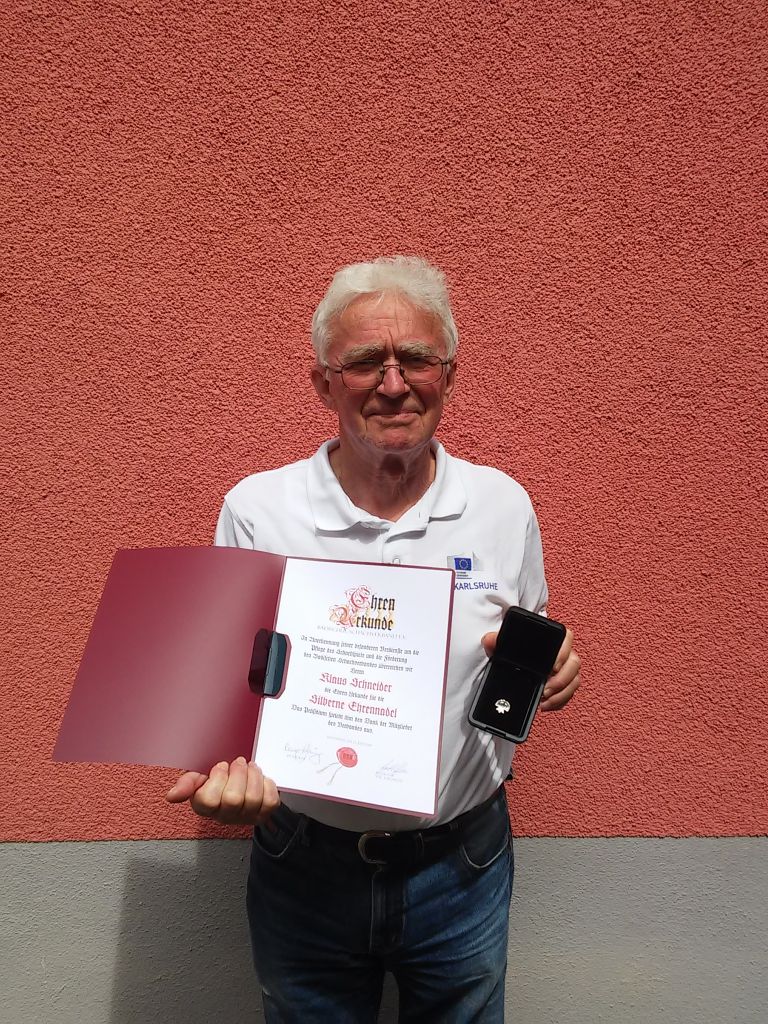 Im Rahmen der letzten Bezirksversammlung wurde unserem Mitglied Klaus Schneider die silberne Ehrennadel des Badischen Schachverbands verliehen (siehe folgendes Bild):