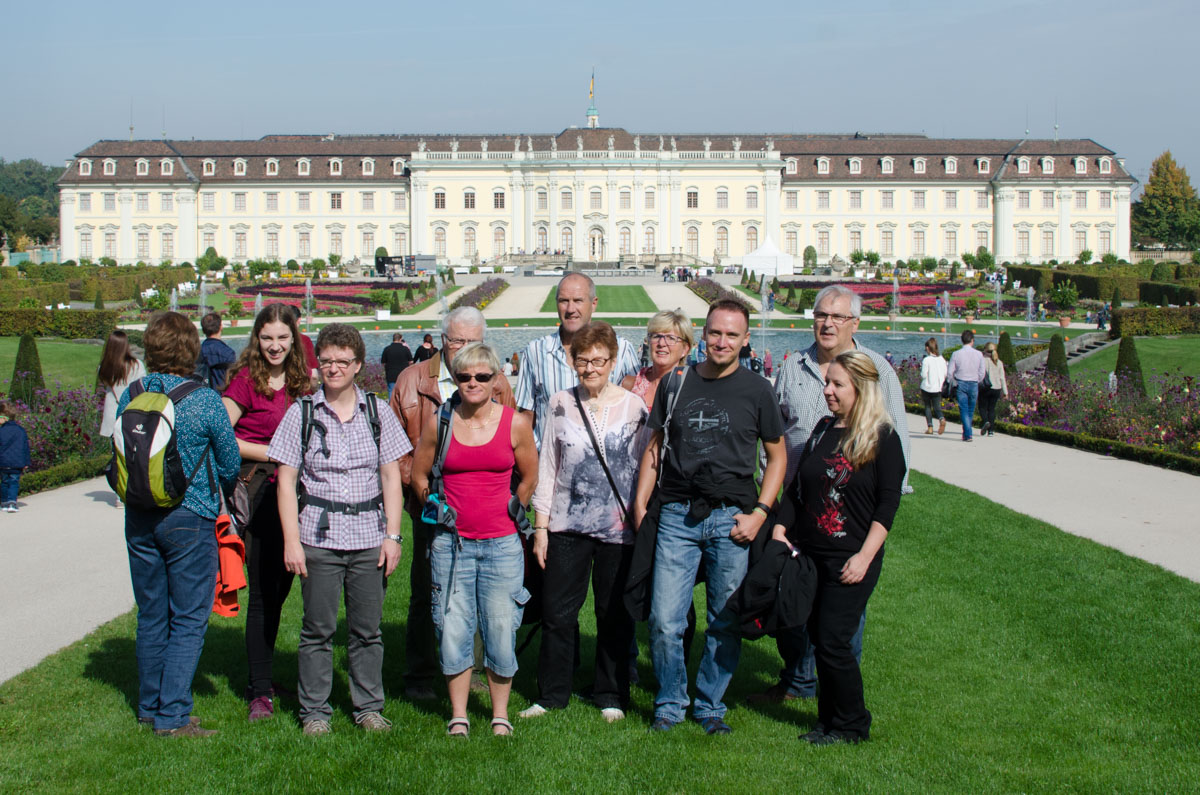 Nachdem der gleiche Ausflug letztes Jahr bedingt durch schlechtes Wetter abgesagt werden musste, war man in diesem Jahr gespannt, ob es besser klappt. Bis Mitte der Woche sah es noch nicht danach aus.Umso erfreuter waren die insgesamt 14 Teilnehmer über das doch sehr schöne Wetter. Die Anreise mit der Regionalbahn war etwas ungemütlich durch die vielen Leute, die an diesem Tag zum Canstatter Wasen unterwegs waren. Viel angenehmer wurde es dann auf dem kleinen Spaziergang zum Residenzschloss Ludwigsburg.